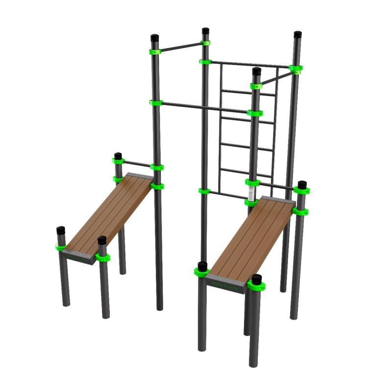 Функциональный комплекс, в котором сочетаются все базовые элементы для тренировки мышц корпуса, спины, рук, пресса и нижней части тела. Подходит для разнообразных тренировок с собственным весом. Каждая скамья имеет разный угол наклона, что позволяет варьировать нагрузку и смещать акцент для изолированной проработки целевых мышц. Комплекс компактный, при этом одновременно обеспечивает шесть тренировочных зон.