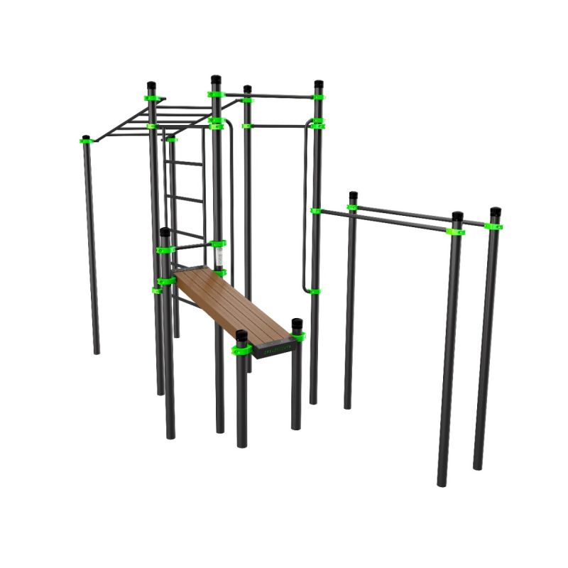 Многофункциональный комплекс для тренировок с собственным весом. Сочетает элементы для подтягиваний, отжиманий, упражнений на пресс и развитие координации: рукоход, шведская стенка, вертикальные и горизонтальные перекладины, наклонная скамья и брусья. Подходит для проработки всех основных мышечных групп и организации как силовых, так и функциональных тренировок. Комплекс компактно размещает несколько снарядов, позволяя одновременно заниматься нескольким пользователям.